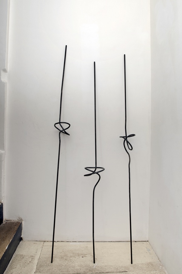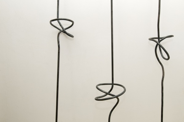 Three iron bars with a lose knot. In the knot theory it’s the easiest possible knot. The french title is literally translated “Hard to do” but “faire” in french is a homophone of the word “fer” meaning iron. The title of the piece is both in french and english. Translation as a way to twist words, and meaning, to make a knot with the tongue, a knot with language.