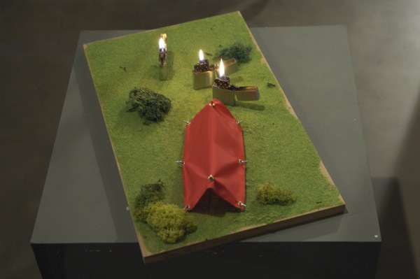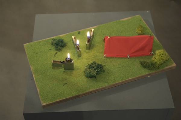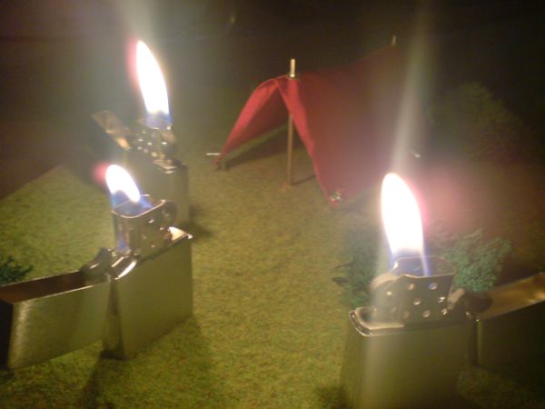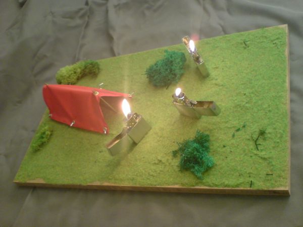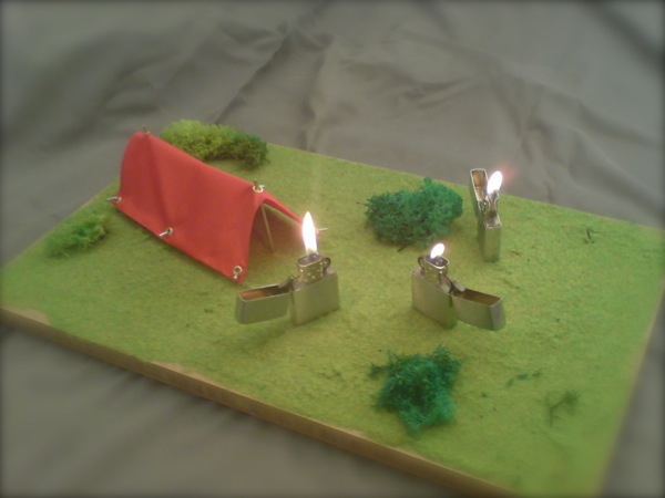 Three Zippo lighters are camping in the wild. They have their little tent. They don't need a fireplace because the fire is within them.