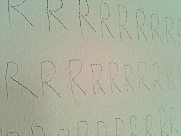 Six thousand times. It's that many times that I wrote the first letter of my first name on the wall. Now this repetition is a way to encact a joke: 6000 in french is said 'six mille' and the letter 'R' sounds like the word 'air' in english. In the end, I spent so time writting six thousand times the letter 'R', that means drawing six thousand times the same line, each one looking pretty much the same as the one before. So all those letters are similar. And that's the point. 'Similar' in french is 'similaire', a word that sound quite similar to 'six mille 'R' '. Word for word, the title means: 'six thousand similar 'R' '.